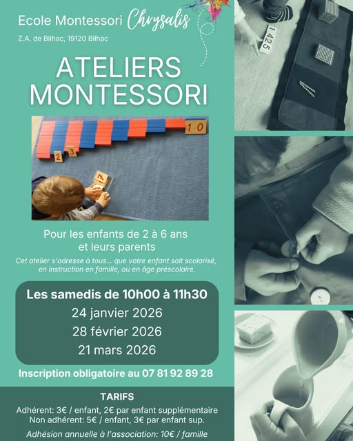 Ateliers Montessori mensuels, les samedis de 10h à 11h30 à l’école Chrysalis de Bilhac.