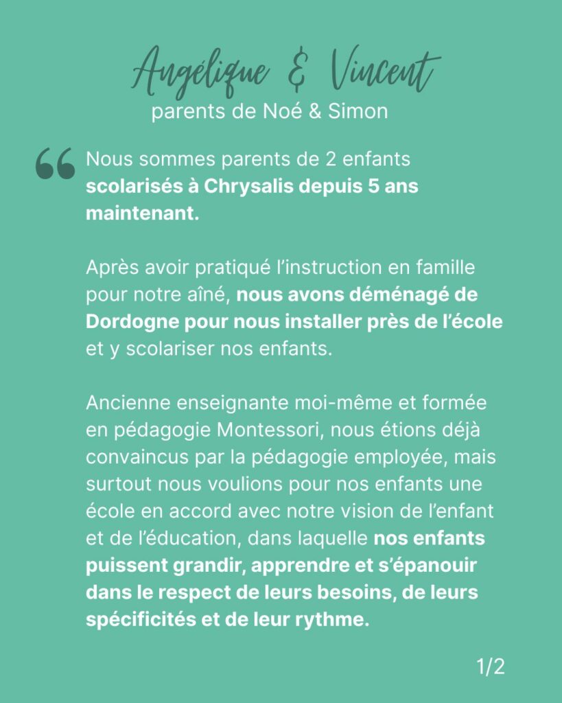 Après avoir pratiqué l’instruction en famille pour notre aîné, nous avons déménagé de Dordogne pour nous installer près de l’école et y scolariser nos enfants. Ancienne enseignante moi-même et formée en pédagogie Montessori, nous étions déjà convaincus par la pédagogie employée, mais surtout nous voulions pour nos enfants une école en accord avec notre vision de l’enfant et de l’éducation, dans laquelle nos enfants puissent grandir, apprendre et s’épanouir dans le respect de leurs besoins, de leurs spécificités et de leur rythme.