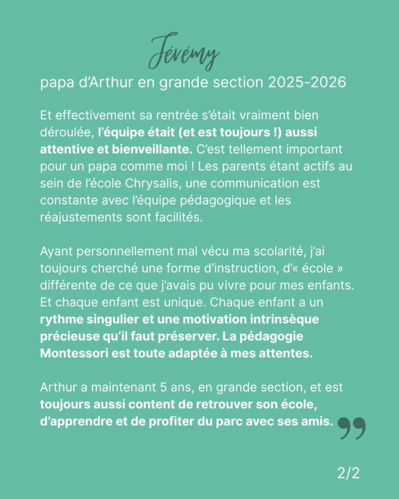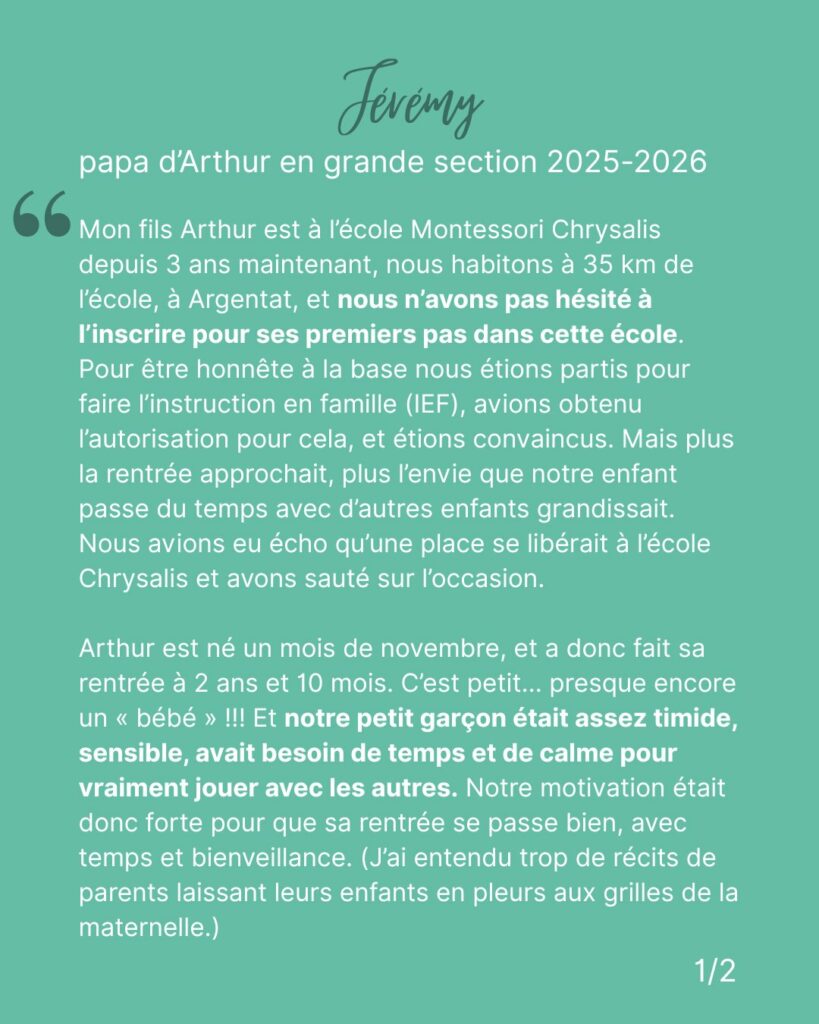 Mon fils Arthur est à l’école Montessori Chrysalis à Bilhac depuis 3 ans maintenant, et j’aimerai vous partager mon témoignage.